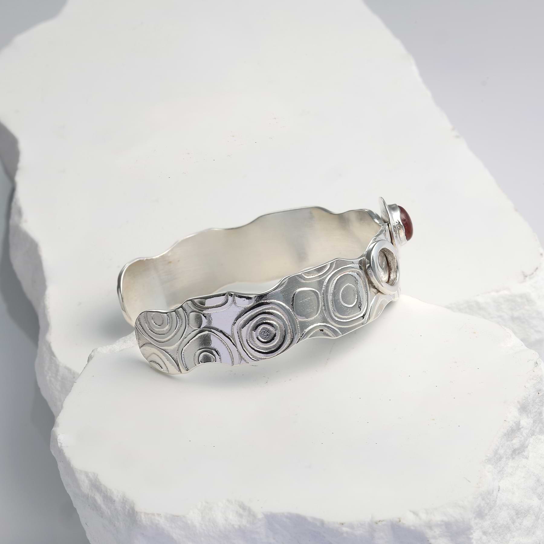 Inspired by the "low key voices" of the cultural movement that empowered women to chart their own paths, this bracelet is a study in individuality. The design features deep, retro-inspired textures—swirls and circles imprinted into bright, tarnish-resistant Argentium silver. The edges are intentionally wavy and organic, mimicking the unpredictable yet beautiful nature of the ocean.